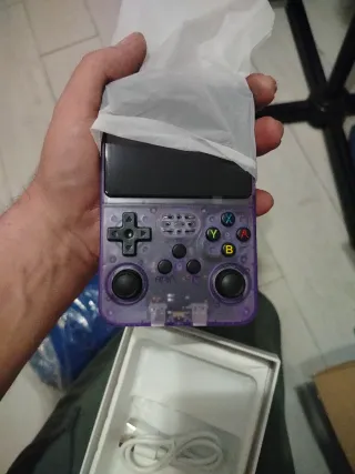Consola portátil para juegos retro, modelo R36S. - Diseño transparente en tonos morados y violetas. - Pantalla de alta resolución. - Controles ergonómicos para una mejor experiencia de juego.