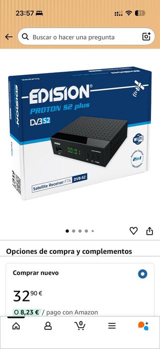 Decodificador de satélite Edision Proton 52 Plus. - Receptor FTA DVB-S2. - Conexión Wi-Fi. - Mando a distancia universal 2 en 1. USB Muy compacto, puedes esconderlo colgado de TV