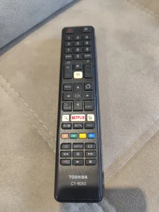 Mando a distancia para TV Toshiba. - Modelo CT-8053. - Botones de acceso directo a Netflix y Guía. - Teclado numérico y botones de navegación. El mando tiene uso pero cuando se estropeó la TV funcionaba perfectamente