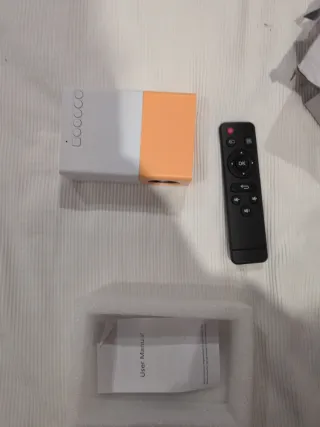 Mini Proyector, Proyector de Video Portátil de Pantalla Enorme de 1920x1080, Proyector de Películas de Cine en Casa Multimedia de 30000 Horas, Compatible con Computadoras Portátiles, Consolas(EU Proyector LED compacto con un diseño moderno en blanco y naranja. Incluye control remoto, manual de usuario y adaptador de corriente. - Lente de proyector. - Rejilla de ventilación. - Botones de control en el proyector. - Control remoto con botones de navegación y OK. - Adaptador de corriente con cable.