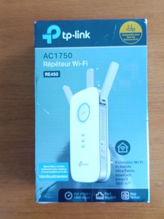 Extensor de Wi-Fi TP-Link RE450 AC1750, versión 2.0, en perfecto estado Mejora la cobertura de tu red inalámbrica. - Compatible con cualquier router Wi-Fi. - Velocidad Wi-Fi AC1750 (450Mbps + 1300Mbps). - Puerto Gigabit Ethernet. - Controlable mediante la app Tether. - Se incluye manual de instalación. Tags: Devolo, tplink, PLC, Mercusys, Tenda, Netgear, Powerline, Fritz, Strong, Linksys, Google, Google Wifi, Google Nest, Dlink