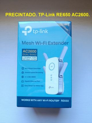 Extensor de Wi-Fi TP-Link RE650 AC2600, precintado CON SU PLASTICO - Tecnología Mesh Wi-Fi. - Doble banda AC2600 (1733 Mbps 5 GHz / 800 Mbps 2.4 GHz). - Elimina zonas muertas Wi-Fi. - Streaming ininterrumpido. - Tecnología 4x4 MU-MIMO. - Puerto Gigabit Ethernet. - Configuración sencilla con la app Tether. No leer: Devolo, tplink, PLC, Mercusys, Tenda, Netgear, Powerline, Fritz, Strong, Linksys, Google, Google Wifi, Google Nest, Dlink