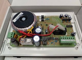 Centralita y seis mandos de la marca INEL. - Centralita blanca. - Seis mandos blancos con botones y pantalla. - Incluye un mando con la indicación 'VOLUME'.