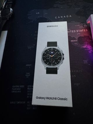 Reloj inteligente Samsung Galaxy Watch 8 Classic con un diseño elegante. - Esfera redonda con detalles en naranja. - Correa de cuero negra. - Bisel giratorio.