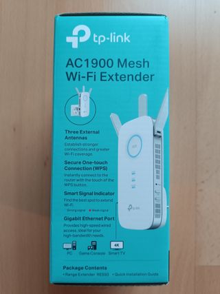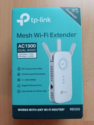 Extensor - Repetidor de red Wifi TP-Link Modelo RE550 de doble banda AC1900. Extiende tu cobertura Wi-Fi. Velocidad de hasta 1300Mbps en 5GHz y 600Mbps en 2.4GHz a la vez. 3 potentes antenas integradas. Aumenta la velocidad y reduce el tiempo de espera. Ayuda a encontrar la mejor ubicación para una cobertura Wi-Fi óptima al mostrar la intensidad de la señal. Configurable desde el móvil con la App TP-Link Tether. Funciona con cualquier router Wi-Fi. Compatible con OneMesh. Funciona perfectamente. Muy poco usado Wifi, internet, network, red, extensor, mesh, deco, plc, tp link, malla, amplificador, intranet, Dual Band wireless