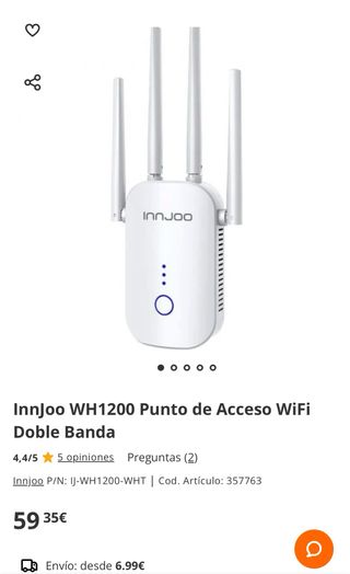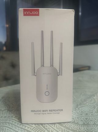 Amplificador de señal de red WiFi con doble frecuencia y punto de acceso inalámbrico equipado de forma que elimine las zonas muertas extendiendo la cobertura del WiFi. El amplificador WiFi InnJoo está equipado con cuatro antenas externas de gran ganancia y móviles que pueden girar hasta 180 grados para reproducir una señal más estable. Esta como nuevo con caja y viene sin instrucciones, se pueden encontrar por internet.