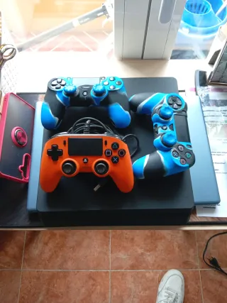 Se vende consola PS4 con tres mandos. - Incluye consola. - Tres mandos (uno naranja y dos con diseño azul y negro). - Cables de conexión.