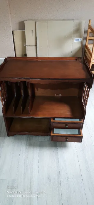 Mesa auxiliar de madera con un acabado en tono marrón oscuro. Cuenta con varios compartimentos para organización y dos cajones. Precio negociable. - Diseño clásico. - Compartimentos para almacenamiento. - Dos cajones con tirador.