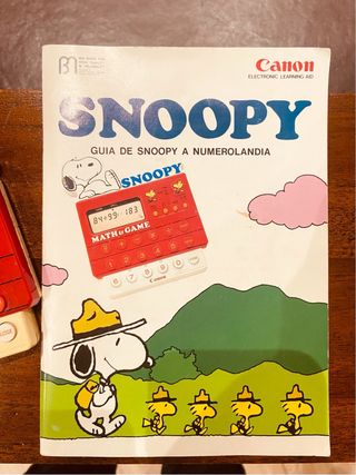 Calculadora electrónica vintage de Snoopy, modelo Math & Game. - Diseño rojo con personajes de Snoopy. - Funciones de cálculo y juegos. - Pantalla digital. - Teclado numérico y de operaciones.