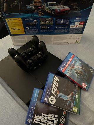 Consola PlayStation 4 en color negro. Se encuentra en excelente estado. - Diseño elegante y moderno. - Acabado mate. -incluye cargadores,3 juegos 2 mandos los cables y su caja original.
