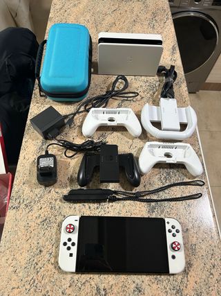 Consola Nintendo Switch OLED en color blanco, junto con accesorios adicionales. - Incluye funda de transporte azul. - Dos soportes para Joy-Con. - Un volante para juegos. - Cargador extra. - Fundas para los joystick de resident evil.