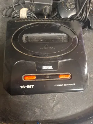Consola Sega Mega Drive II en color negro. Incluye dos mandos, fuente de alimentación y cables. - Consola Sega Mega Drive II. - Dos mandos. - Fuente de alimentación. - Cables de conexión.