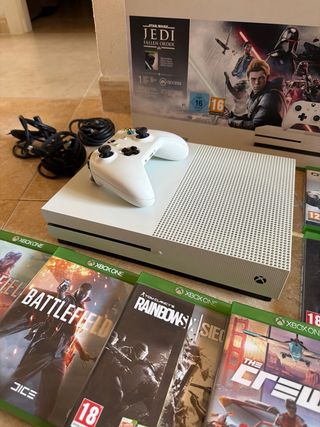 Consola Xbox One S de 1TB en color blanco, con un mando y 7 videojuegos. Trae tambien todos los cables + un USB para cargar el mando (como se puede ver en la foto). Se envia con su caja original - Star Wars Jedi: Fallen Order - Overwatch - Call of Duty - Rocket League - Battlefield V - Battlefield 1 - Rainbow Six Siege - The Crew 2 Siempre ha estado en una vitrina, nunca expuesto al sol