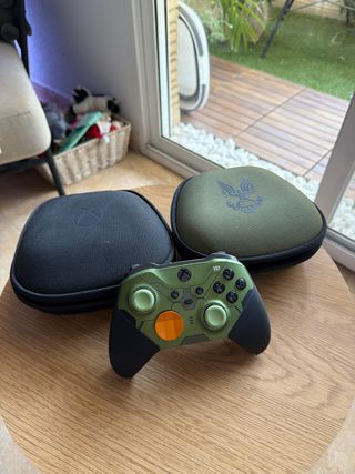 Mando personalizado de Xbox Elite Series 2 con temática de Halo. Viene con su caja original y una nueva de Halo. La caja de halo trae un cable para cargar, una base de carga y todos los accesorios para el mando La caja original viene con todos sus accesorios tambien. Incluyo la carcasa antigua pero le falta la goma trasera - Diseño inspirado en Halo. - Color verde y negro con detalles naranjas. - Incluye funda de transporte negra y funda de transporte verde de Halo.