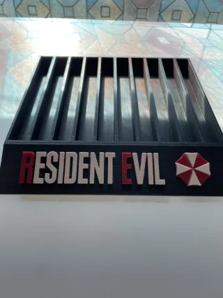 Soporte para juegos de PS5 con diseño de Resident Evil. Ideal para organizar tus juegos. - Diseño temático de Resident Evil. - Compartimentos para juegos.