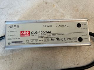 Fuente de alimentación de la marca Mean Well, modelo CLG-150-24A. - Voltaje de entrada: 100-240VAC. - Voltaje de salida: +24V. - Corriente de salida: 6.3A. - Protección IP65. - Fabricado en China.