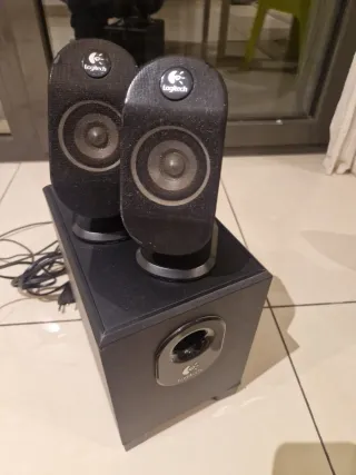 Sistema de altavoces Logitech en color negro. Incluye dos altavoces satélite y un subwoofer. - Diseño compacto.
