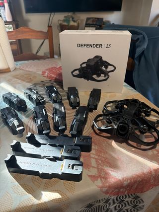 Drone FPV Defender 25 en color negro, listo para volar. Incluye varios accesorios para complementar tu experiencia. - Drone Defender 25 - Múltiples baterías - Adaptadores de carga