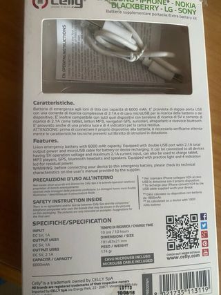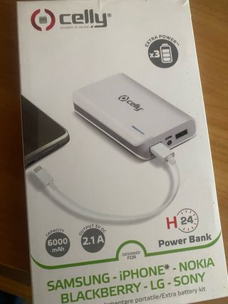 Batería externa Celly de 6000 mAh. - Capacidad: 6000 mAh - Salida: 5V DC, 2.1 A - Compatible con Samsung, iPhone, Nokia, Blackberry, LG y Sony. - Incluye cable de carga.