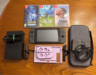 Consola Nintendo Switch en color gris, lista para jugar. Incluye varios juegos y accesorios para complementar tu experiencia. Muy buen estado. 🎮 Juegos incluidos: Pokémon Diamante Brillante, The Legend of Zelda: Breath of the Wild, FIFA 22. ➡️ Accesorios: Base de carga, Joy-Cons, funda de transporte gris, funda de silicona morada, cargador original y cables HDMI