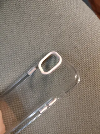 Funda protectora transparente para iPhone 15. Botones i contorno cámara rosas