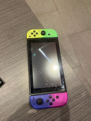 Consola Nintendo Switch con un diseño único en colores verde y morado. - Joy-Con izquierdo en morado y azul. - Joy-Con derecho en verde y amarillo. Los mandos no son lo originales Incluye los accesorios