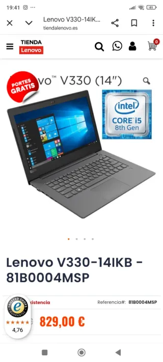 Vendo portátil Lenovo IdeaPad 330-15IKB en muy buen estado y bien cuidado. Funciona perfectamente. 🔋 Batería cambiada hace una semana, completamente nueva, con muy buena autonomía. Características: Pantalla: 15.6” Full HD Procesador: Intel® Core™ i5-8250U Memoria RAM: 8 GB Almacenamiento: 256 GB SSD Sistema operativo: Windows 10 Tiene ligero desgaste estético en algún lateral, propio del uso, pero no afecta en absoluto al funcionamiento. Entrego con su caja. Lo vendo porqué me he comprado un macbook.