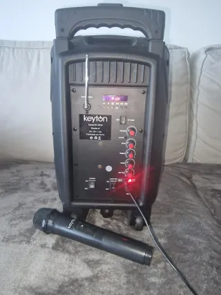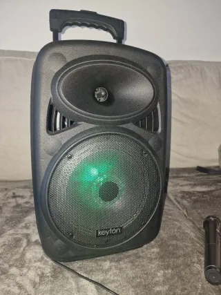 Altavoz portátil Keyton con función karaoke y luces LED. - Incluye micrófono. - Luces LED integradas que cambian de color. - Diseño robusto y asa para transporte. También lleva ruedas para moverlo con mayor comodidad,está probado y todo funciona a la perfección,en su caja original,mide entre 40/45 cm de largo