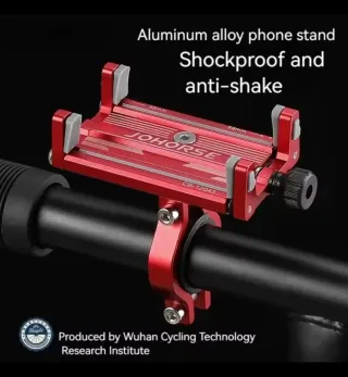 Soporte de aluminio para teléfono móvil, diseñado para bicicletas. Es resistente a golpes y vibraciones. - Material: Aleación de aluminio. - Color: Rojo. - Ajustable para diferentes tamaños de teléfono. - Fabricado por Wuhan Cycling Technology Research Institute.