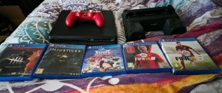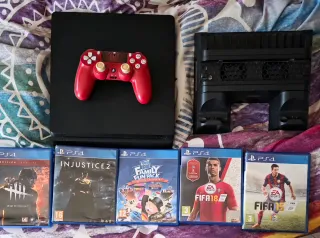 Se vende pack de PlayStation 4 en color negro. Incluye un mando de color rojo y cinco videojuegos, modelo slim de 1 tb, en perfecto estado, con soporte ventilador - Consola PlayStation 4 - Mando DualShock 4 rojo - Dead by Daylight - Injustice 2 - Family Fun Pack - FIFA 18 - FIFA 15