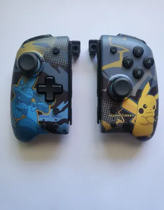 Mando de Nintendo Switch con diseño de Pokémon. - Diseño de Pikachu y Lucario. - Colores azul, amarillo y gris.