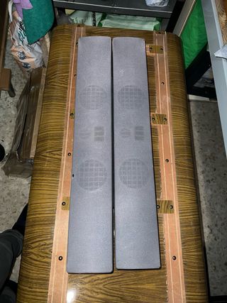 Altavoces para TV en color gris. En buen estado, conexión por cable
