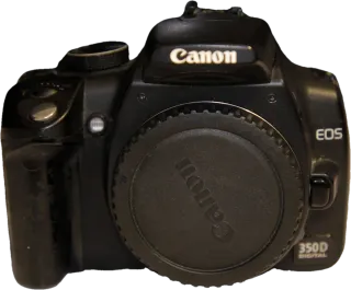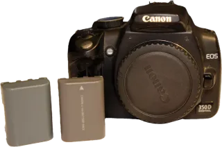 Cámara réflex Canon EOS 350D en color negro y gris. Incluye accesorios para empezar a usarla. - Cámara Canon EOS 350D. - 2 baterías. - 2 tarjetas de memoria. - Cargador.