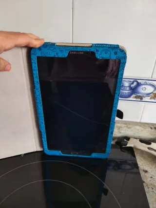 Tablet Samsung en color azul, con funda protectora. - Pantalla con una grieta visible. - Funda con diseño infantil. - Lo que se ve roto es el protector de pantalla, que se le puede quitar. - Funciona. - Funda giratoria.