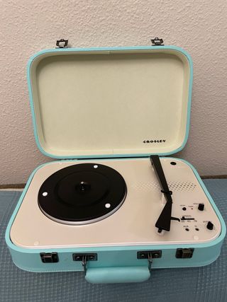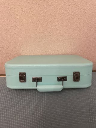Tocadiscos de maleta de estilo vintage, perfecta para decoración o escuchar tus vinilos favoritos. - Diseño con cierres metálicos. - Asa central para facilitar el transporte. - Acabado en material texturizado.