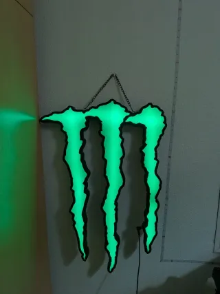 Este letrero LED con el icónico logo de Monster añade un toque distintivo a cualquier espacio. - Diseño del logo de Monster. - Iluminación LED en color verde. - Borde negro. - Cadena para colgar incluido. -Tiene des pequeños arañazos sin importancia. -44cm ancho x 64 cm de alto.