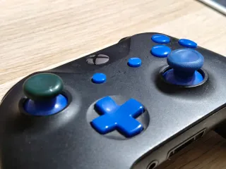 Mando de Xbox en color negro con detalles en azul. El joystick izquierdo esta descolorido. - Botones en azul.
