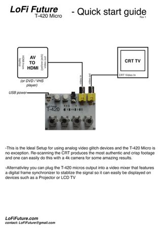Dispositivo Lofi Future T-420 para efectos de video glitch. -control por cv - Entradas y salidas RCA. - Conexión de audio jack 3.5mm. - Botones de modo y bypass.