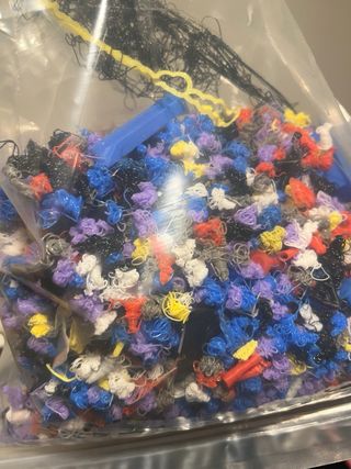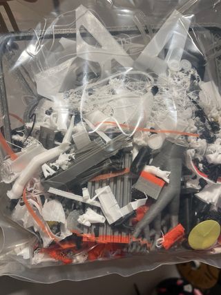 Lote de torres de purga y restos de filamento de Bambu Lab. Ideal para reciclar o experimentar. - Materiales variados de impresión 3D. - Piezas de diferentes colores y formas.