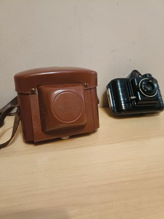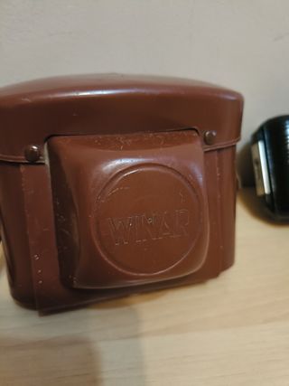 Cámara fotográfica antigua winar con su funda de cuero. - Cámara de color negro. - Funda de cuero de color marrón.