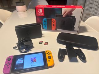 Consola Nintendo Switch con Joy-Cons en morado y amarillo. Incluye todos los accesorios originales para empezar a jugar. - Base de carga para la consola. - Adaptador de corriente. - Joy-Cons (morado y amarillo). - Agarre para Joy-Cons. - Funda protectora. - Dos juegos. - Cables.