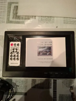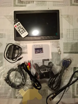 Monitor LCD a color de 10.1 pulgadas. Incluye control remoto y varios cables de conexión. - Pantalla de 10.1 pulgadas. - Control remoto incluido. - Cables de conexión (RCA, VGA, BNC). - Adaptador de corriente.