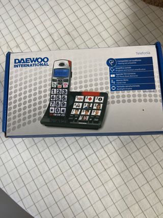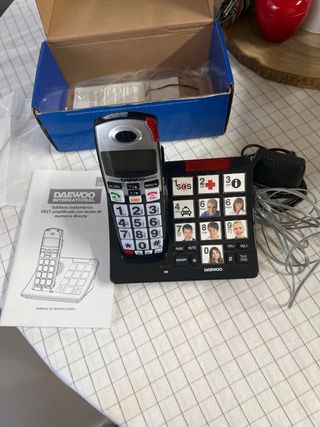 Teléfono inalámbrico Daewoo con funciones de accesibilidad. - Compatible con audífonos. - Amplificación de sonido. - Agenda con 150 números. - Función manos libres. - Pantalla retroiluminada.