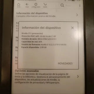 Kindle de 7ª generación en color negro, incluye funda. Tiene marcas de uso, se ven en las fotos. Pero funciona perfecto. - Modelo: Kindle (7.ª generación) - Dirección MAC wifi: 00:BB:3A:AB:C1:BF - Número de serie: 90C60706 5253 0151 - Versión de firmware: Kindle 5.12.2.2 - Espacio disponible: 2,99 GB