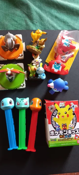 Colección de figuras de Pokemon. Incluye 10 figuras: 3 dispensadores Pez de Charmander, Squirtle y bulbasaur. Figura de Pikachu e Eevee Figura de los iniciales de galar Volcarona Terrakion Popplio Rotom x2