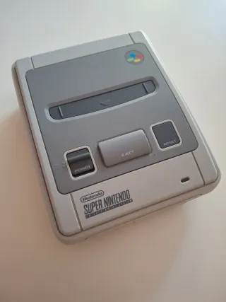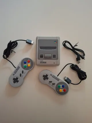 Consola clásica Super Nintendo Mini. Tiene 21 juegos preinstalados. Incluye mandos y cables, se ha usado muy poco. Viene con su caja original y libro de instrucciones.