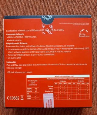 Módem USB Vodafone para acceso a Internet. - Modelo: HSUPA K3765 - Conexión: USB - Incluye guía de inicio rápido