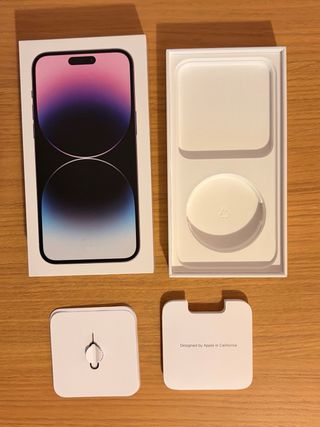 Caja original para iPhone 14 Pro Max color morado.