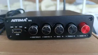 NO REBAJO NI RESPONDO A OFERTAS. Amplificador clase D, 2.1 canales. AIYIMA B01 en color negro. Incluye mando a distancia. - Entradas: RCA, Bluetooth y USB. - Controles de tono para graves y agudos. - Control de frecuencia de corte y volumen para subwoofer pasivo. - Salida para subwoofer activo. - Puerto USB frontal. - Alimentador 24V. 4A. Chip amplificador Texas Instruments TPA3116D2. En perfecto estado con su caja original. Apenas usado. Vendo por cambiar a modelo superior.