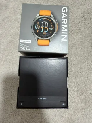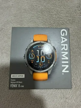 Reloj deportivo Garmin Fenix 8 con pantalla AMOLED y cristal de zafiro. Diseño moderno en tonos naranja y plateado. - Pantalla AMOLED. - Cristal de zafiro. - Correa de color naranja. - Caja de color plateado. - nuevo a estrenar.